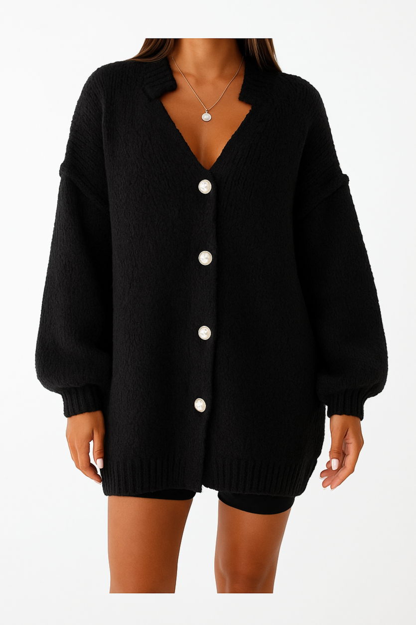 Stijlvol, warm en altijd comfortabel. Dit gebreide vest is een tijdloze aanvulling op je garderobe.Met de lange ballonmouwen, comfortabele losse pasvorm en klassieke knoopsluiting draag je hem moeiteloos zowel casual als chic. Het zachte breisel voelt heerlijk cozy aan en houdt je warm tijdens d...